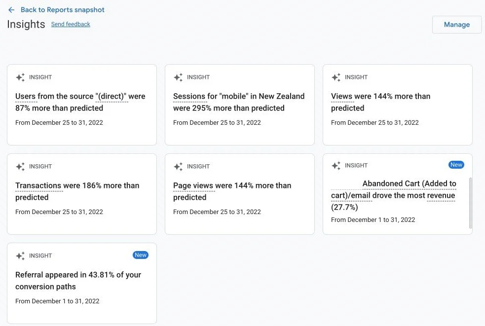 Here's where automated insights have been handy: to spark ideas. It's well worth looking at this page every week or so and seeing what comes up - any insight you encounter should have a reason. For example, if transactions were up over 100% - was that because we ran a sale? If New Zealand traffic grew substantially, have we been investing in that region - and how engaged are those sessions?